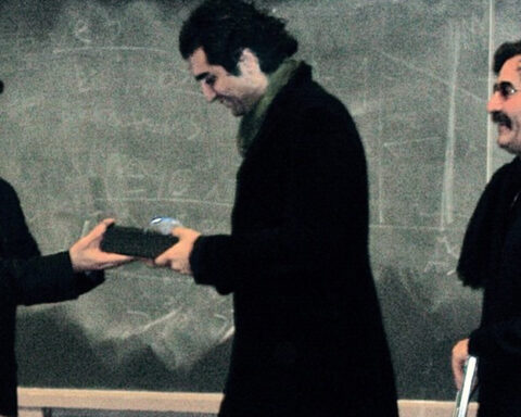 ادامهدر عکسی از یک کلاس درس با پسزمینهی تختهسیاه، بستهای دارد ردوبدل میشود. معلوم نیست حافظ ناظری دارد بسته را به آدمی که سمت چپ تصویر ایستاده، محمد حافظی (که حالا استادیار فیزیک دانشگاه مریلند است)، میدهد یا از او میگیرد. پشت حافظ، پدرش شهرام ناظری دارد با لبخند صحنه را…
