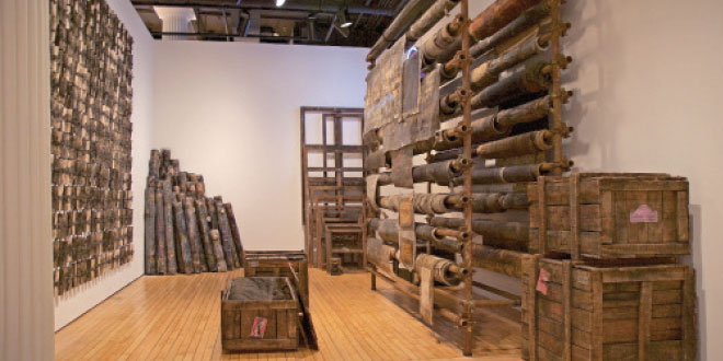 شهره فیضجو آثارش را با زبان فراگیر اجناس و کالاهای تجاری ارائه میکند: «محصولِ …»؛ بنابراین تکتک اشیا نامِ برَند، برچسب قیمت و تاریخ دارند و کلیت کار- که در غیر این صورت صرفاً چیدمانی خستهکننده میبود- بدون اینها مانند غرفهی باعجله سرهمبندیشدهای از یک بازار روز است با صندوقها و کوزههای میوه، بطریها و شیشهها و کیسههایش؛ صندوقها و جعبههای خالیشدهای که انگار از انبار عمدهفروش، سکوهای ایستگاه راهآهن یا اسکلهی بندر آمدهاند. این طاقهها، که انگار بر داربستی بازشدنی چیده شدهاند، چیزی چون طاقههای فرش دارند؛ با حالوهوای طاقههای قالی، برزنت یا کاغذدیواری. طاقههای دیگری که بسته و ایستاده کنار هم گذاشته شدهاند، و تختهکارهایی که بهترتیب اندازه بهصف شدهاند، همگی ما را به رنگفروشیای معرفی میکنند که فقط «سیاه» میفروشد. راهمان را به بازاری یافتهایم که غرابت و رازآلودگی و نیز کنایت مغشوش و هولناکِ یک بقالی آخرالزمانی را دارد.