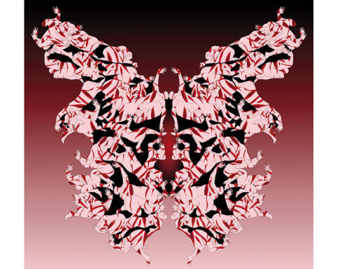 نوارهای رنگی در هم پیچ میخورند، بالا میروند و در دو نقطه به یکدیگر گره میخورند. تلاقی آنها چشمان پرترهای را میسازد که زل زده است و انگار دستبردار هم نیست. نظارهگر جمعی است که با بالارفتن کارتها سرهایشان به سمتی از تالار میچرخد. چکشی محکم روی میز کوبیده میشود…