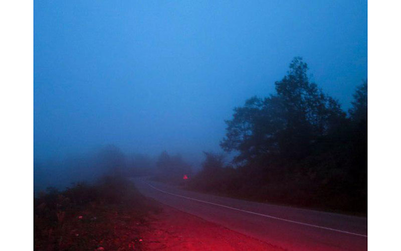 وقتی وارد نمایشگاه می‌شوید، فقط کافی است سرتان را یک دور بچرخانید و یک نگاه گذرا و کلی به دیوارها بیندازید تا آبیِ درون کارها شما را احاطه کند. لازم نیست حتماً به تابلوها نزدیک شوید تا متوجه رازآلود بودن آنها شوید، رنگ غالب آبی به‌خوبی توانسته فضای مبهم تصاویر را منعکس کند اما وقتی به عکس‌ها نزدیک شوید، به‌ظاهر آثاری ساده می‌بینید. منظره‌هایی که بارها دیده‌ایم همچون پیچ‌های جاده، خانه‌ای کاهگلی درون روستا و جاده‌ای بر فراز کوه‌ها و جنگل‌ها اما این تمام ماجرا نیست. عکس‌ها واضح نیستند، بخشی از آنها به دلیل هاله یا مه آبی‌رنگی است که قسمتی از فضا را در تسخیر خود دارد و برخی به‌عمد فوکوس نشده‌اند همچون درخت‌هایی که با آسمان پشت سرشان ترکیب شده‌اند یا انتهای مسیرهایی که مشخص نیستند. نور ماشین هم در برخی از عکس‌ها جاده را روشن کرده البته تنها در حد همان چند قدمی که خط سفید جاده معلوم شده است اما روشنایی خیلی هم کمکی نکرده چون امتداد راه مشخص نیست و خودتان باید تصمیم بگیرید که برگردید یا ادامه بدهید. به‌هرحال رازی در میان است اما اینکه از کجا آمده، و چه هست، مشخص نیست. هرچه باشد عکاس دوست داشته آن را با بیننده شریک کند و به‌نظر می‌رسد از پس این کار هم برآمده است.