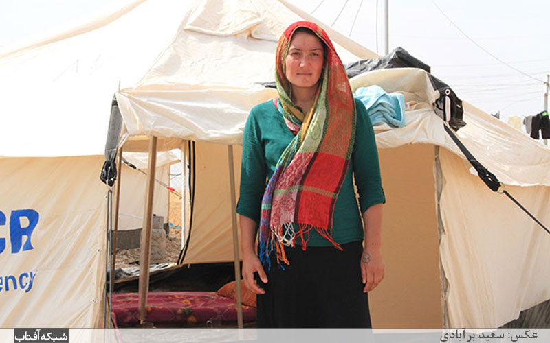 به ریشهی فرش ماشینی پهنشده کف چادر سازمان ملل دست میکشد. بدن درشتی دارد، زن زحمتکشیدهی صحراست، با دستهای زمخت و پوست آفتابسوخته. تحسین از برادرش هم میگوید، پدر بچهای که در راه است و معلوم نیست در کمپ آوارگان ایزدی به دنیا خواهد آمد یا در شنگال: «حراس وطنی است. در عراق است و در مأموریت نظامی. ۱۰ روز سر پست میماند و ۱۰ روز هم میآید پیش ما. روزگار سختی هم دارد او. آنجا که هست با مرگ روبهروست، اینجا که میآید نگران بچه و زنش.»