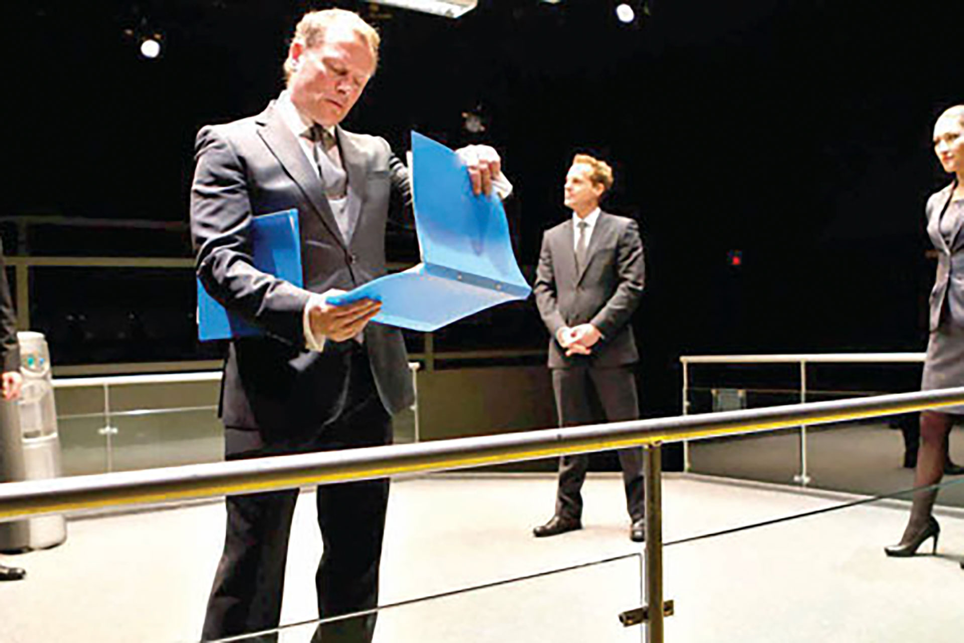 در طول گفتوگوی ما بارتلت برای توصیف جهانِ نمایشنامهی «گاو» مدام به عبارت «آیین» اشاره میکند. آیینِ ذاتیِ مراسمِ گاوبازی، که در آن نهادینه شده است، بهواسطهی فروکردن نیزههای مربوط به این مراسم در بدن هیولایی شاخدار در برابر جمعیتی عربدهکش شناخته شده که نتیجهی ازپیش تعیینشدهای در پی دارد که همان مرگ خونبارِ آن هیولاست. به همین ترتیب نمایشنامهی «گاو» همچون آیینی مکتوم و پوشیده در زمانِ واقعیِ بدون قطع اتفاق میافتد و در همین حین ما مخاطبان این اثر نمایشی شاهدیم که توماس چگونه بهدست ایزابل و تونی از مقام و ردهاش تنزل پیدا میکند تا در فهرست افرادی قرار بگیرد که قرار است شرکت در برنامهی تعدیل نیرو آنها را اخراج کند. علاوه بر این حس دلسردانهای از همدردی ذاتی در ارتباطِ مخاطب با کنشی که دارد رخ میدهد وجود دارد؛ حسی که طراحی صحنهی سوترا گیلمور آن را حسابی تقویت میکند. او محیطی بسته و خفه طراحی کرده که پر از شیشههای پولیششده و میلههای استیل ضدزنگ است. همچون دیگر نمایشنامههایش، اینجا هم مایک بارتلت دقت و حواسجمعیِ کافی دارد تا مخاطب را در موقعیت قرار دهد: «اگر طراح خوبی داشته باشید، او سرنخهای نمایش و مسیر را طوری دنبال میکند که نمایشنامه میخواهد آنطور به چشم بیاید. نمایشنامهای طولانی نیست -فقط یک ساعت است- بنابراین میخواهید شدت و حدت نمایش را حفظ کنید. میخواهید آنها [تماشاگران] هنگام دیدن کنشهای روی صحنه به جلو خم بشوند و ژستی از مشارکت در این نمایش به خود بگیرند. همهی آن چهرهها و قیافهها تحت فشار این جهان و تحت فشار شخصیت مرکزی هستند؛ و این مسأله فشار را روی آنها بیشتر و بیشتر میکند.»