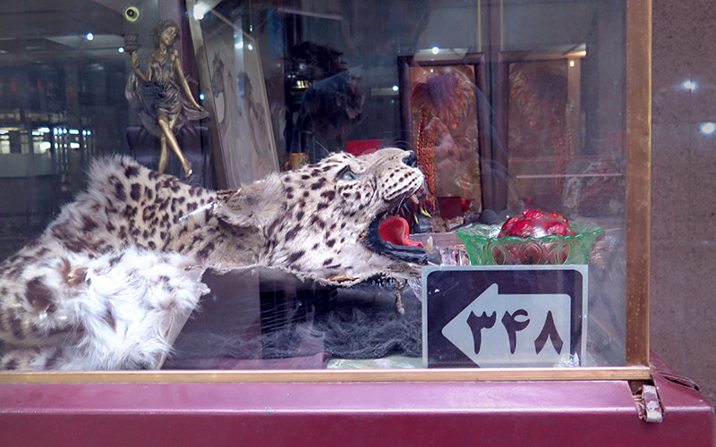 چند قدم آنطرفتر در طبقهی دوم مجتمع، مغازهی بزرگتری هست که تا عمق آن پوست و اشیایی است که از حیوانات وحشی درست شدهاند. درِ این مغازه بسته است اما پشت ویترین پوست خالخال یک حیوان گوشتخوار با جثهی متوسط به دیوار میخ شده. شماره تلفنی هم برای دسترسی آسان به صاحب فروشگاه روی کاغذی نوشته شده، فروشنده بدون نگرانی به تلفن افراد ناشناس پاسخ میدهد: «آن پوستِ بزرگ مال گربهی وحشی است و ۴۵۰ هزار تومان قیمت دارد. روی این پوست میشود با دست و سوزن کار کرد.» مرد فروشنده درباره پوست دیگر حیواناتی که میفروشد، میگوید: «آن کلاه سمور قهوهای را دیدید؟ ۱۵۰ هزار تومان است. ما پوست خرس، راکون، روباه و آهو هم داریم اما روی پوست آهو نمیشود با سوزن کار کرد.» فروشنده دربارهی احتمال برخورد قانونی با خرید و فروش این پوستها میگوید: «آن گربهی وحشی را از چین وارد کردهام، این گربهها پرورشی هستند. خرید و فروش پوست حیوانات ایرانی ممنوع است. اما اینها خارجی هستند.»