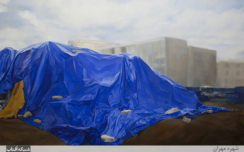 تابلوهای تازهاش، نقاشیهای بزرگی بهشدت ریزپرداخت و کارشده، دربارهی پوشاندنند. لفافی گاه ضخیم و گاه نازک، گاه شفاف و گاه مانعِ دید، آمده روی چیزها را گرفته، آمده از دسترس خارجشان کرده. با دیدنِ نقاشیها بهآنی میفهمیم پسِ این لفافها چیست. نمیتوانند کاری کنند یکسر نفهمیم چی را در بر گرفتهاند، اما آیا لابهلای این دستههای گُل، توی این ماشینها، وسطِ ظلمتِ خانههای نیمهکاره، رازی، چیزی دیگر هست که باید از نگاهِ ما پنهان بماند؟ انگار خودِ همین سؤال یکی از اصلیترین منابعِ الهامِ شهره مهران برای این کارهای تازهاش بوده: اسمِ مجموعهشان را گذاشته «هرچه زیرِ پوشش قرار میگیرد تخیلم را به پرواز درمیآورَد»، و در توضیحشان هم نوشته: «اینجا چه چیزی پنهان شده؟ آن چیست که نباید دیده شود؟ در پسِ هر استتار رمزی نهفته و رازی جاری است. لابهلای چین و واچینِ زندگی روزمره، اشیایی را میبینم که در پارچههای ضخیم پیچیده شدهاند. بند و سنگ و طناب و سیم مانع میشوند که پرده کنار رود و شیئی خود را برملا کند. وضوح ممکن نیست، شفافیت مخدوش شده.گوشهی پیادهرو، کنار جاده، گرد تیرآهنها، روی سنگ و سیمان، سرتاسرِ آسمان: آنچه نباید دیده شود همهجا هست، پوشیده و خاموش، و ما استتار را میپذیریم.»